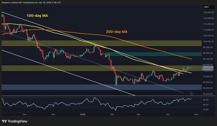 Bitcoin’s price has seen a steady rise, currently trading at $78,000 as April concludes. This upward movement has taken the cryptocurrency above the midpoint of the $75,000–$80,000 resistance band. Unlike previous volatile surges, this ascent has been more measured and orderly, suggesting a potential buildup for a significant breakout ahead.