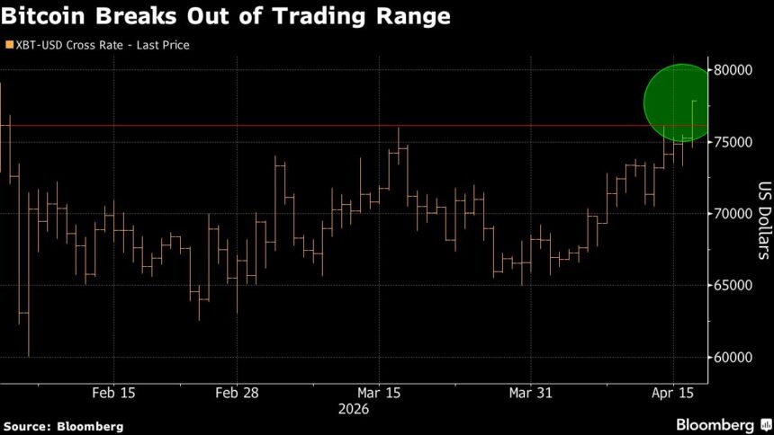 Bitcoin surged to its highest value since early February, breaking through the upper limit of its trading range amid renewed optimism surrounding potential resolutions to the ongoing Middle East conflict. The cryptocurrency reached a peak of $78,343, soaring as much as 4.1% before adjusting slightly.