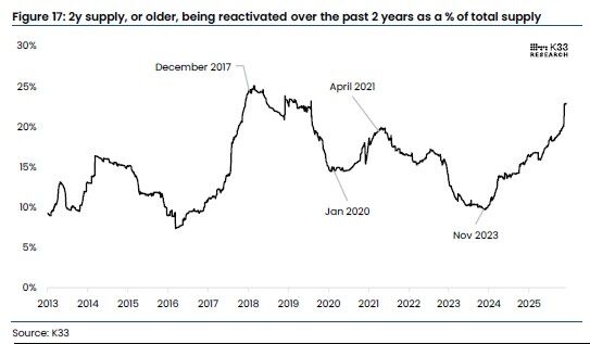 K33 Senior Analyst Vetle Lunde pointed out that contrary to previous cycles, the recent reactivations of Bitcoin are not driven by altcoin trading or protocol incentives. Instead, they are fueled by deep liquidity from U.S. ETFs and treasury demand, allowing early investors to lock in profits at significant price points while lessening ownership concentration. The activity seen over the past two years marks the second and third-largest long-term supply reactivations in Bitcoin’s history, only eclipsed by events in 2017.