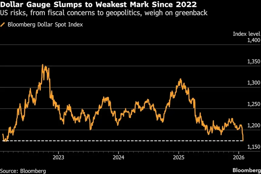 President Donald Trump’s recent comments regarding the dollar have sparked speculation about a potential long-term decline for the U.S. currency. Following his statement on Tuesday indicating that he did not perceive an excessive weakening of the dollar, the currency posted its steepest one-day drop since the rollout of tariffs last year. Bloomberg’s dollar gauge plummeted as much as 1.2% in response to the remarks, diminishing the appeal of the dollar and U.S. Treasuries, which has led to what is now being referred to as the “debasement trade.”